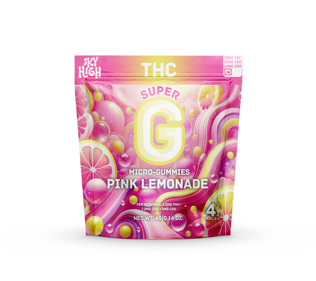 Quench your cravings with the refreshing taste of Super G Pink Lemonade Micro-Gummies. Each micro-gummy is infused with a powerful blend of cannabinoids, featuring 30mg CBG + 20mg CBD + 10mg THC per package or 7.5mg CBG + 2.5mg CBD + 2.5mg THC per serving/micro-piece - for a balanced and potent experience. Conveniently packaged with 4-micro-pieces per package.